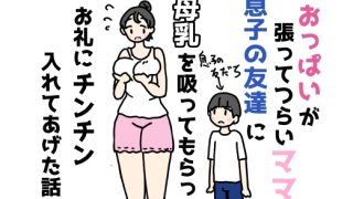 おっぱいが張ってつらいママ息子の友達に母乳を吸ってもらったお礼にチンチン入れてあげた話サークル: ニホンツノ王サークルHP: 発売日: 20...